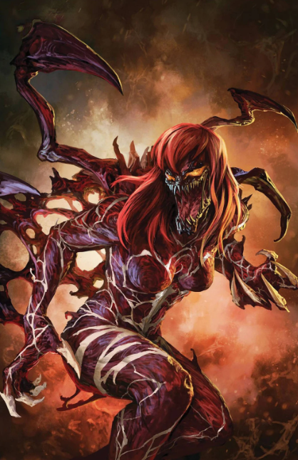 An experiment with the Life Foundation resulted in creating a new symbiote from a fusion between the Carnage and Anti-Venom symbiotes. During a battle with Corwin Jones, Alchemax’s former Guardsman, the flask containing the symbiote fusion was broken, allowing the new symbiote to bond with Liz Allan.