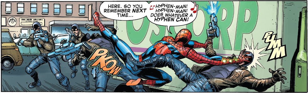 In End of Spider-Verse #1, Parker stresses that his alter-ego name has a hyphen, to the criminals he’s fighting with, “You said it too fast. It’s not ‘Spiderman.’ There’s a hyphen in there.” He even sings a parody of the Spider-Man theme song, caroling “Hyphen-Man! Hyphen-Man! Does whatever a hyphen can!“