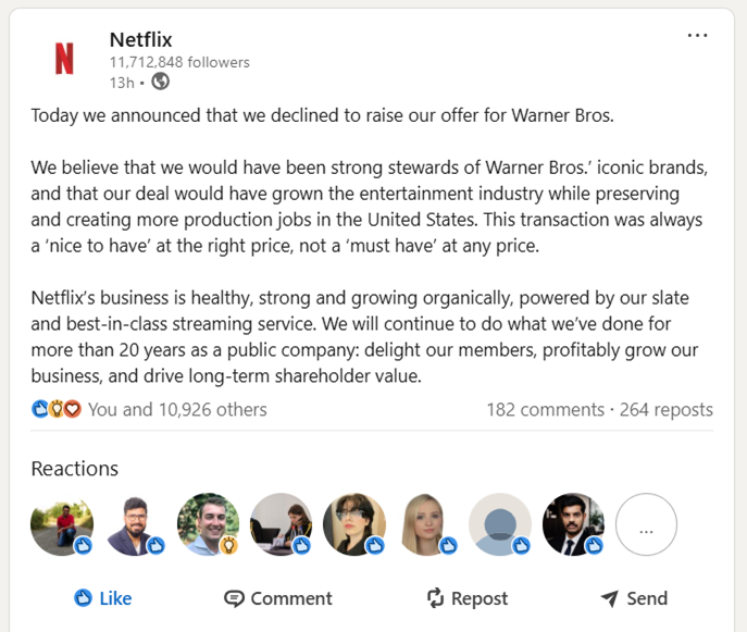 Yeah, Netflix decided to bow out, citing financial discipline and saying the deal was not worth pursuing at a higher valuation, in its LinkedIn post.