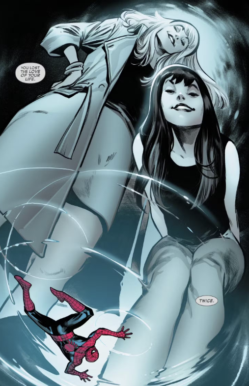 Spidy thinks about all the people he lost and all. He hears words from Uncle Ben, Shay Marken, and piercing insults from Harry Osborn and Ben Reilly. But what hits Peter the most is a remark from Captain Stacy, reminding him that he lost the love of his life…twice! His hallucination changes to a vision of Gwen and Mary Jane looking down at him as he struggles.