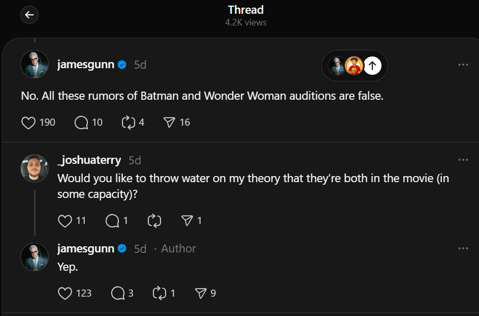 The online rumors of Bruce Wayneand Diana Prince appearing in Man of Tomorrow were growing unchecked. James Gunn responded: