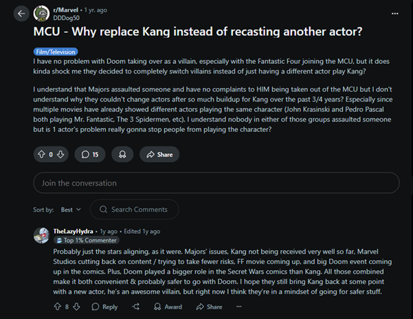 On the Marvel Reddit page, a fan wrote, “I have no problem with Doom taking over as a villain, especially with the Fantastic Four joining the MCU, but it does kinda shock me they decided to completely switch villains instead of just having a different actor play Kang?”